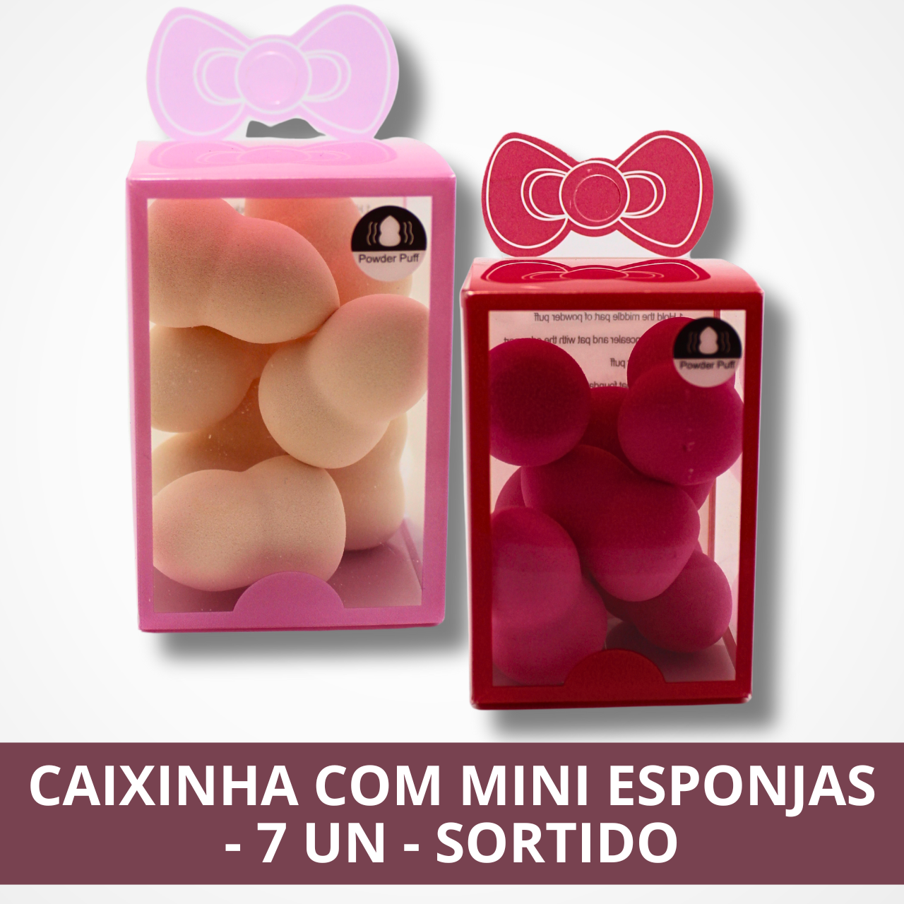 Caixinha com Mini Esponjas contém 7 esponjinhas sortidas, perfeitas para aplicar e espalhar maquiagem com precisão e suavidade.