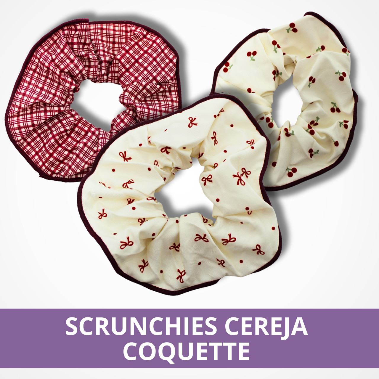Os Scrunchies Cereja Coquette trazem a estampa de cerejinhas que é puro encanto, perfeita para quem ama um toque feminino e vintage no look.