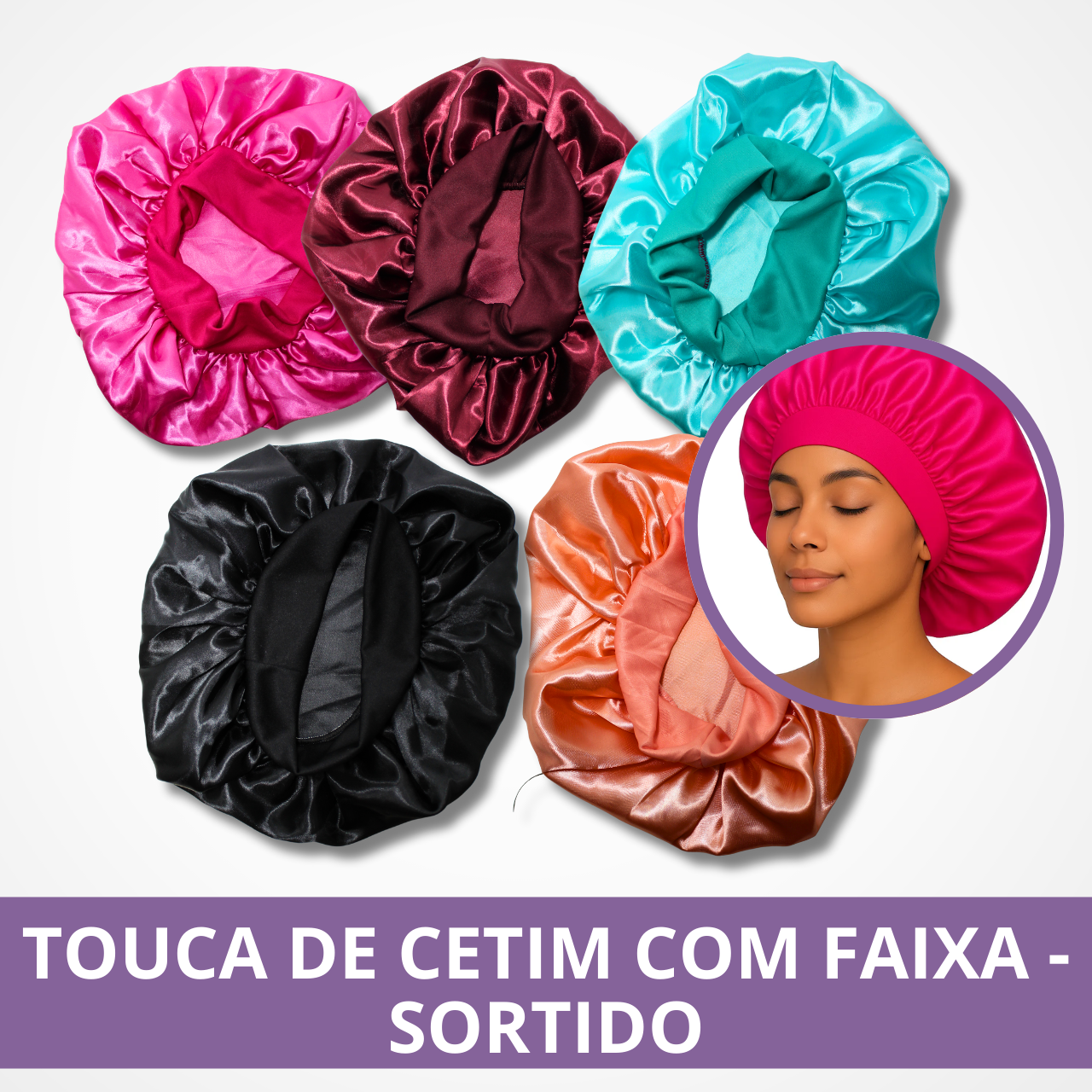 Mantenha seus cabelos protegidos, alinhados e livres do frizz com a Touca de Cetim com Faixa!